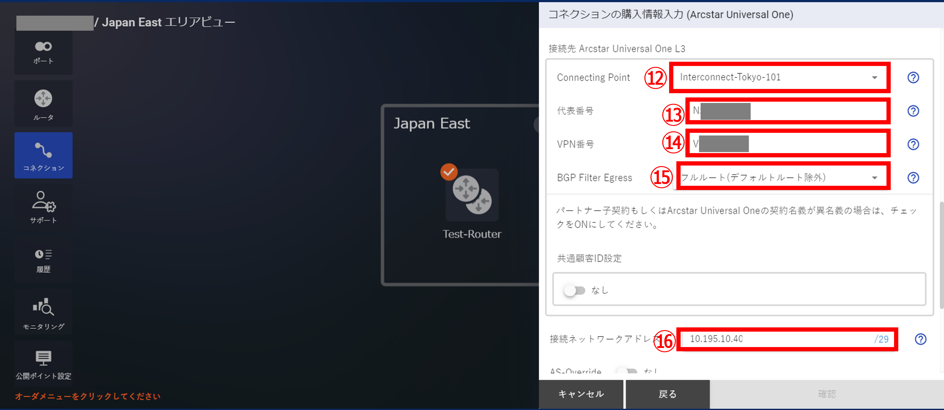 3.7.5 コネクションの購入情報入力画面①(Arcstar Universal One)