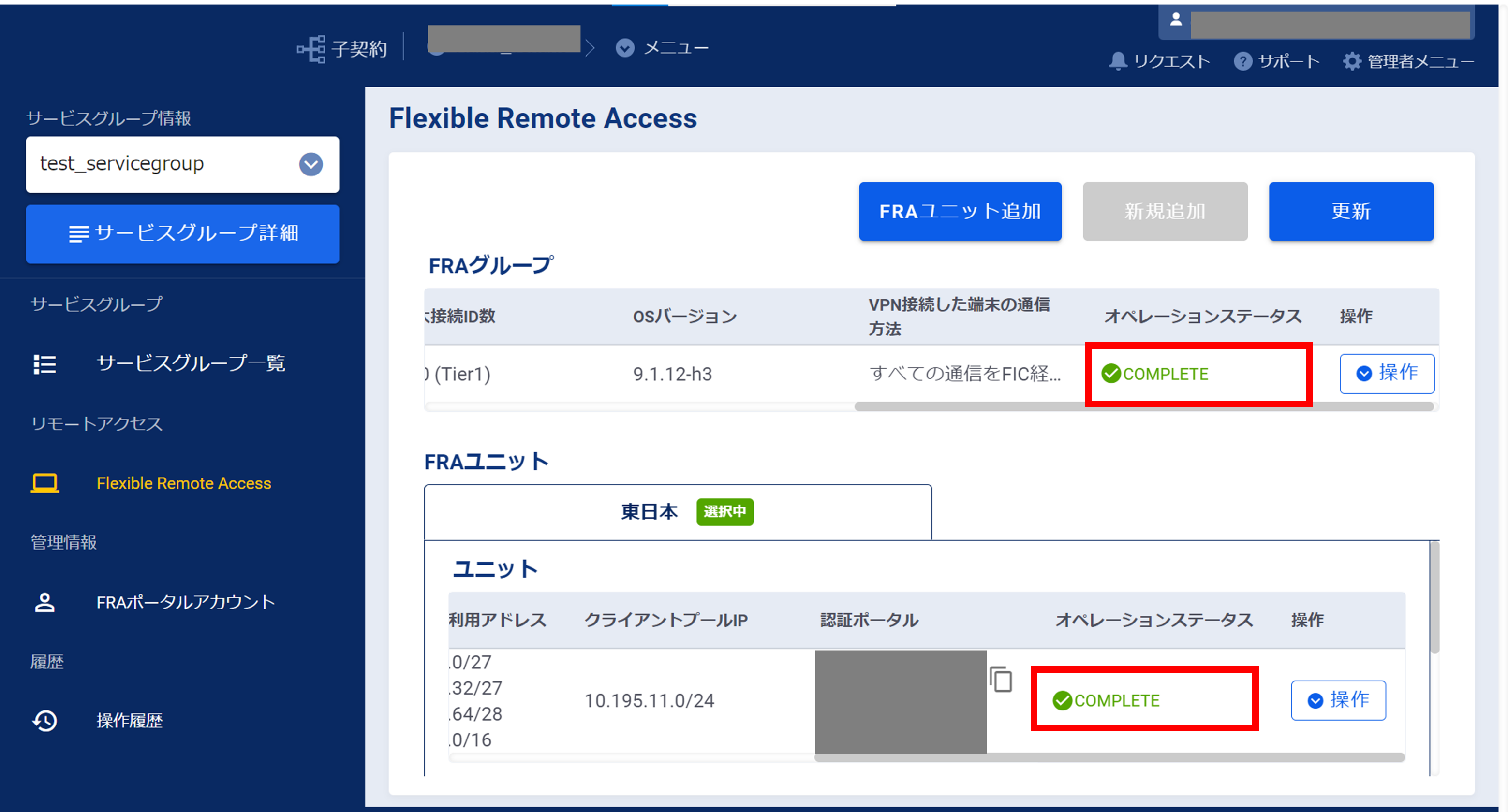 - 初期構築時はインターネット向き通信とFIC向き通信のポリシーが無効化の設定になっています。FRAポータルアカウント作成後、FRAポータル上でポリシー設定を実施してください。設定方法については こちら をご参照ください。