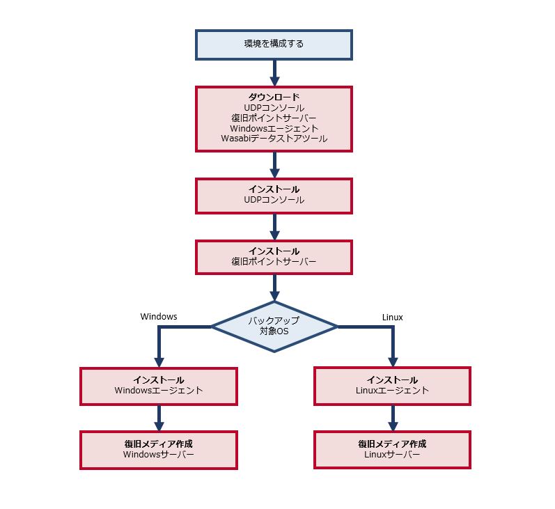 SDPFの環境にArcserveを導入し、WasabiへのバックアップおよびWasabiからサーバーインスタンスへのリストアを実施するまでの流れを、各章に基づいてご説明します。