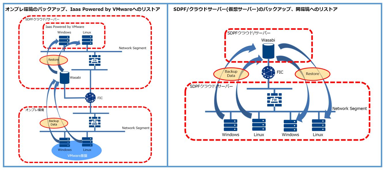 本項では、SDPF複合サービスをご利用いただくにあたり事前検討事項、ならびにFlexible InterConnect(以下FIC)、Wasabiオブジェクトストレージ(以下Wasabi)、Arcserve UDP(以下ArcserveUDP)、SDPFクラウド/サーバー内のサーバーインスタンス(以下サーバーインスタンス)の環境構成についてご理解いただき、以下に示す基本的なご利用方法について記載しています。