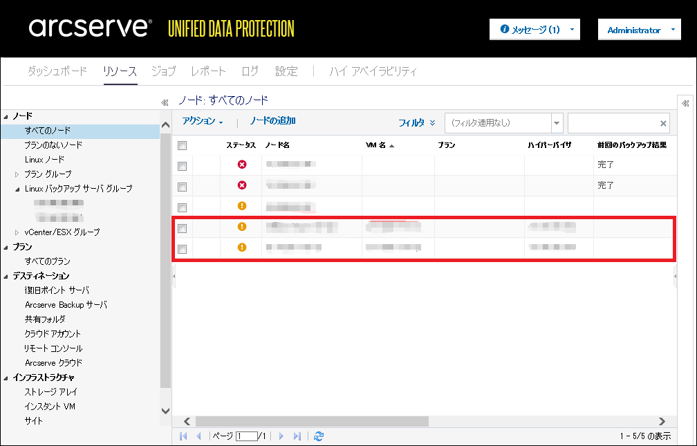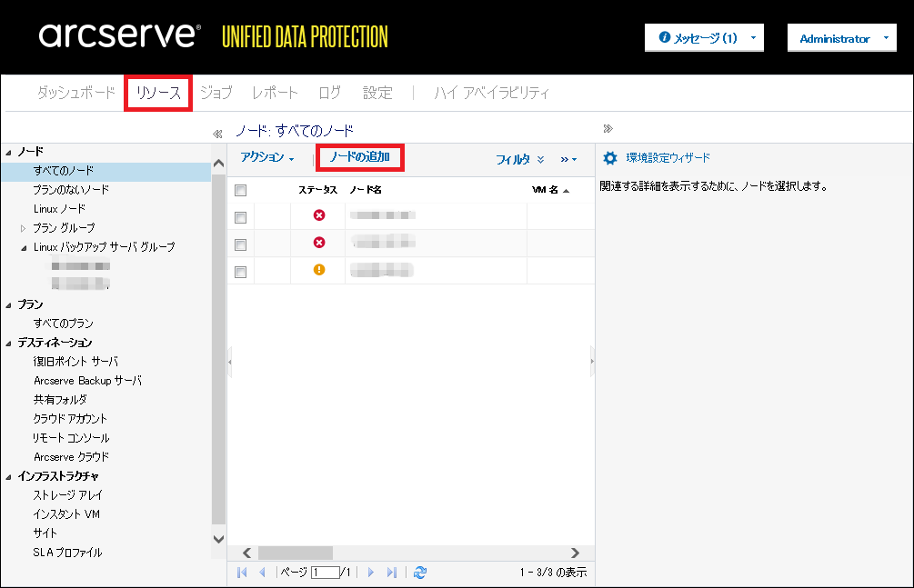 バックアップ対象のVMware基盤上のWindows仮想マシンをノード追加するため、画面上部の[リソース]タブをクリックし、[ノードの追加]をクリックします。