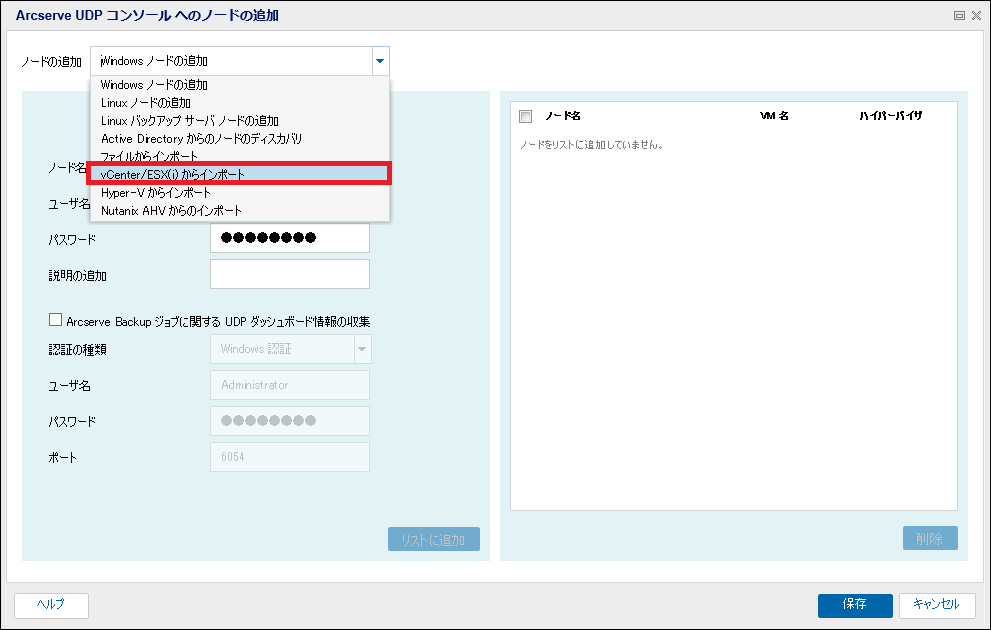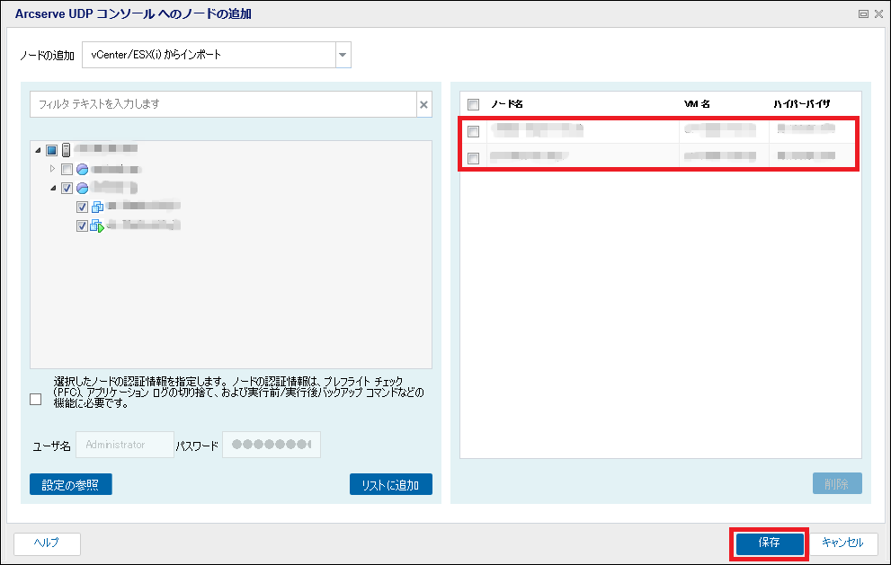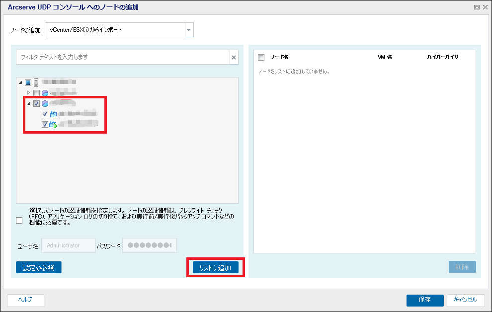 - 右ペインにノードが追加されます。全ての保護対象ノードの追加が完了したら、[保存]をクリックします。