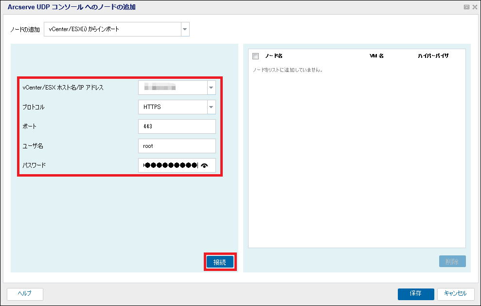 ESX(i)の「ホスト名/IPアドレス」、「プロトコル」、「ポート」、「ユーザ名」、「パスワード」を入力し、[接続]をクリックします。
