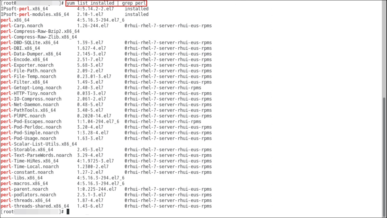 yum コマンドで「perl」がインストールされているかを確認します。本事例では以下のように既にパッケージが入っておりインストールされています。
