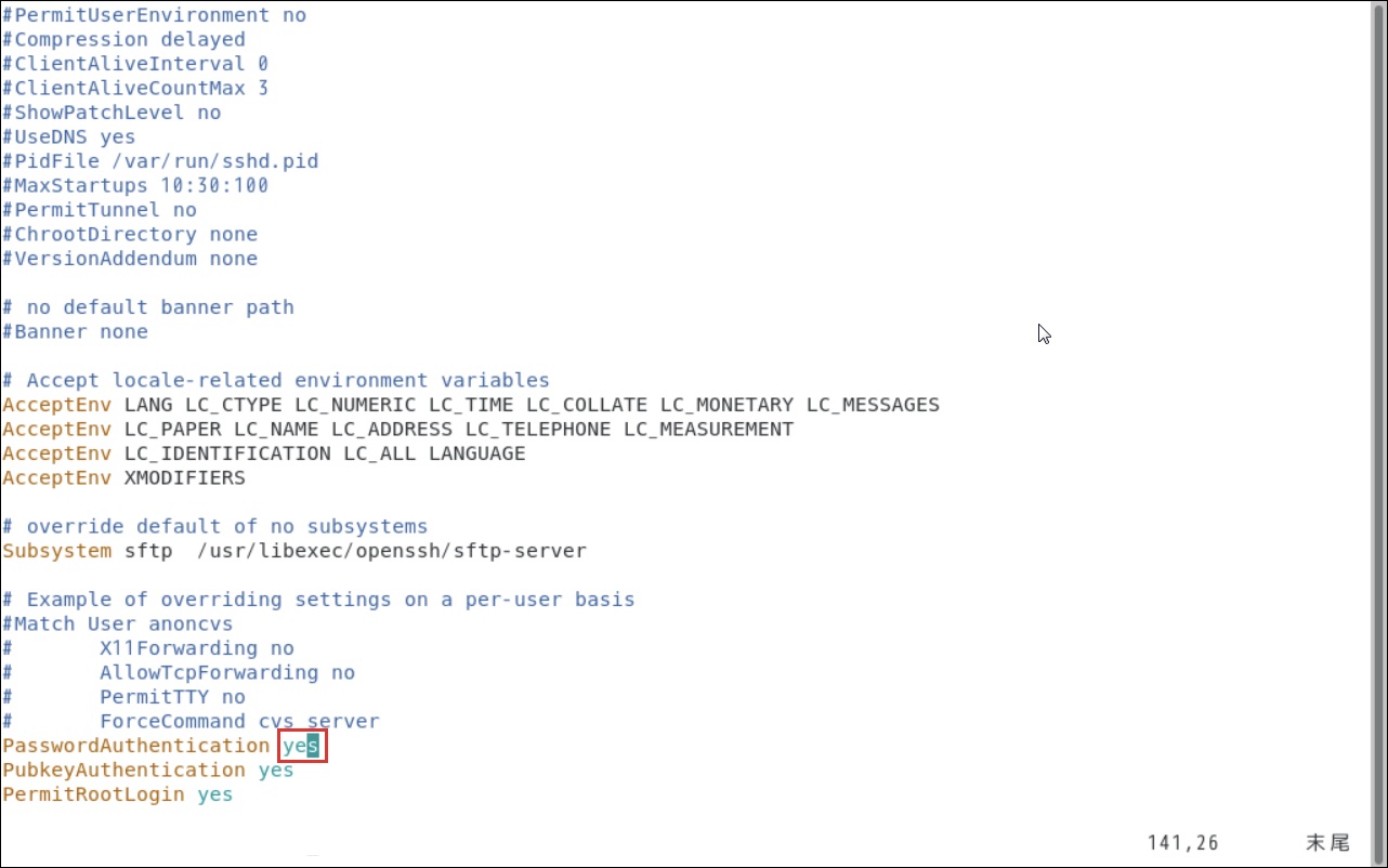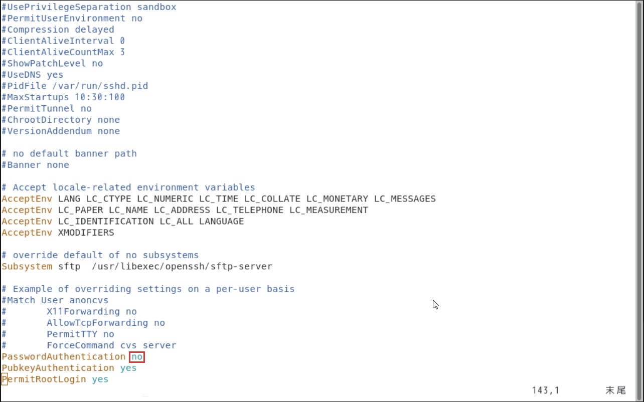「PasswordAuthentication」がnoになっていることを確認します。