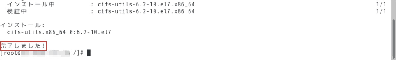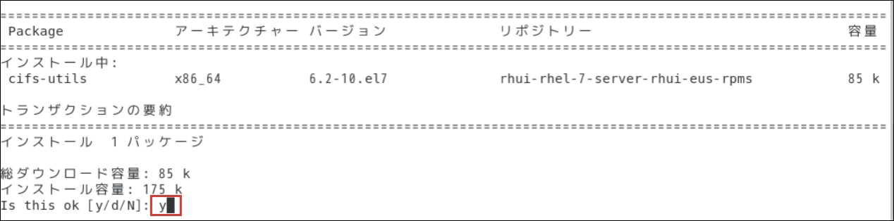 $ yum list installed | grep cifs-utils「cifs-utils」を以下のようにインストールします。インストール実行のy/n選択では「y」を選択します。