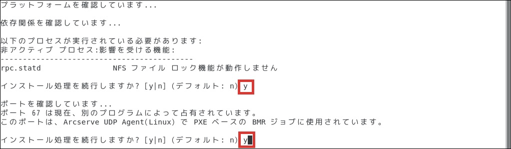 「インストール処理を続行しますか?[y/n](デフォルト:n)」では「y」を選択します。