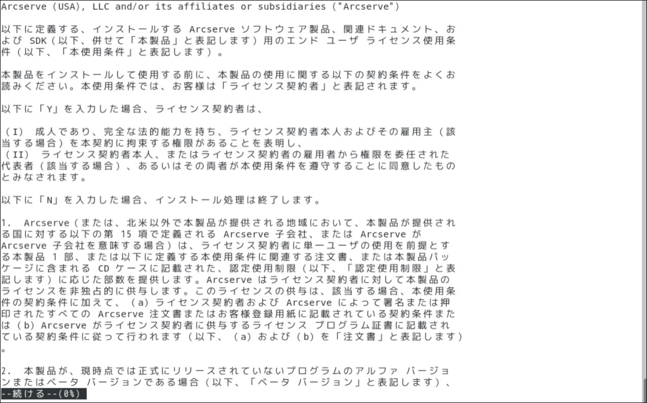 - Arcserveを以下コマンドを実行し、インストールしていきます。※/tmp上にインストールファイルが配置されており、現在のプロンプトが/tmpディレクトリにある状態とします。