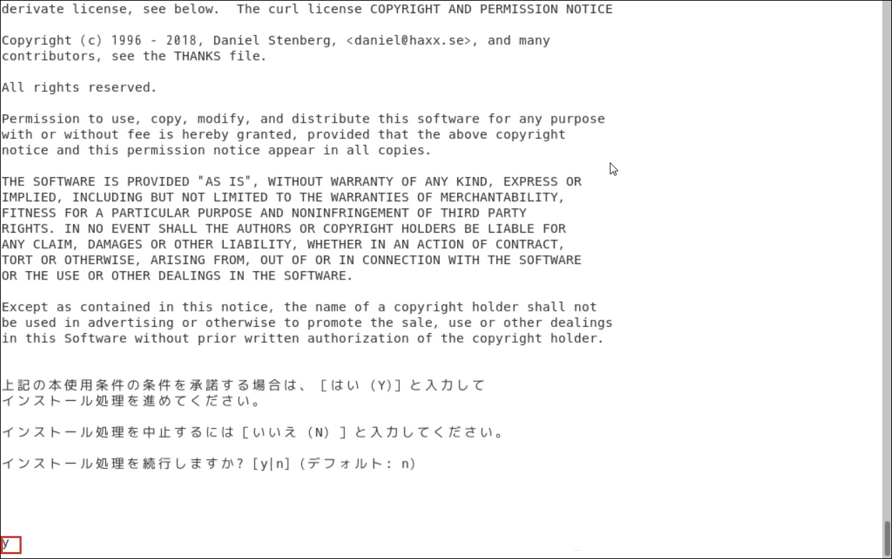 使用条件を承諾する場合は、「y」を入力します。
