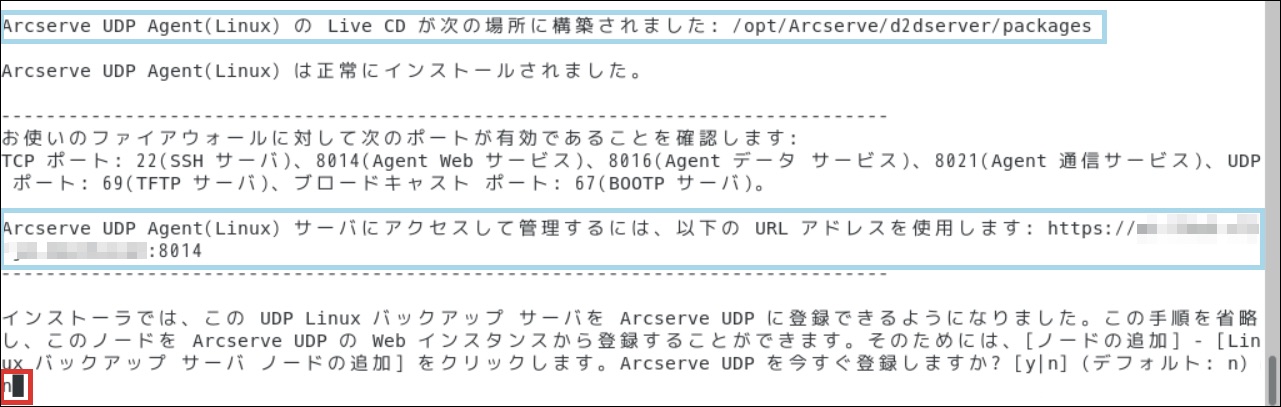 「インストーラでは、このUDP LinuxバックアップサーバをArcserve UDPに登録できるようになりました。…」は、「n」を選択します。