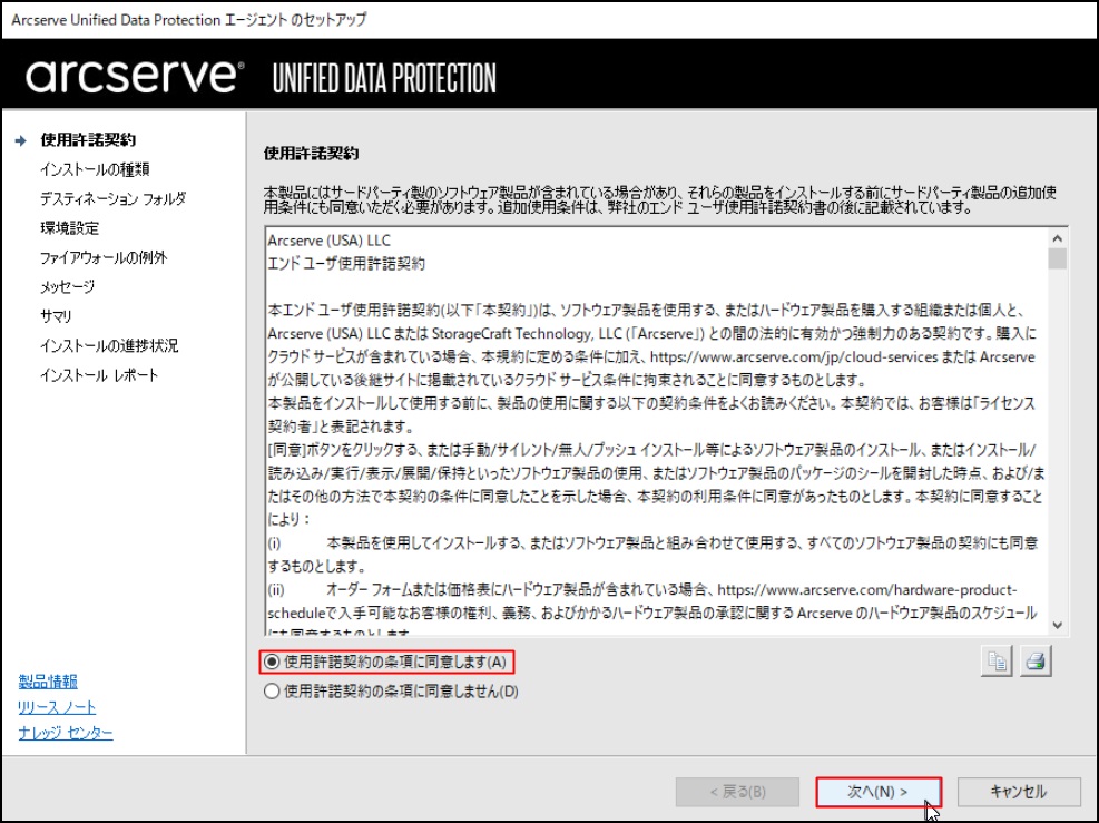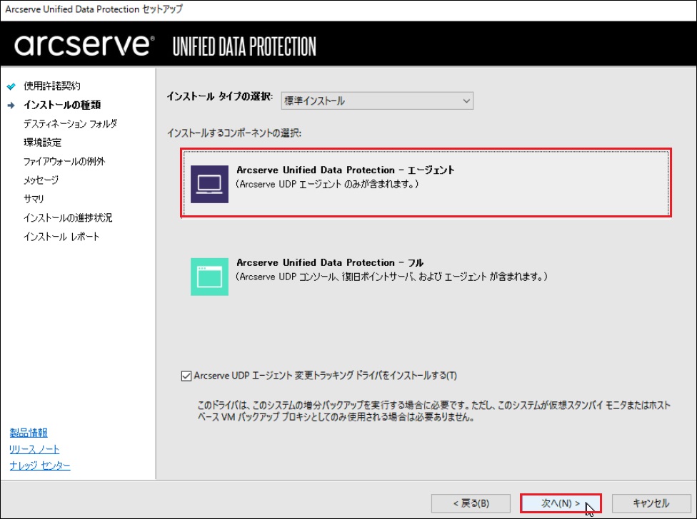 - [Arcserve Unified Data Protection-エージェント]を選択し、[次へ]をクリックします。※ここでは、「Arcserve UDPエージェント」のみ、インストールします。