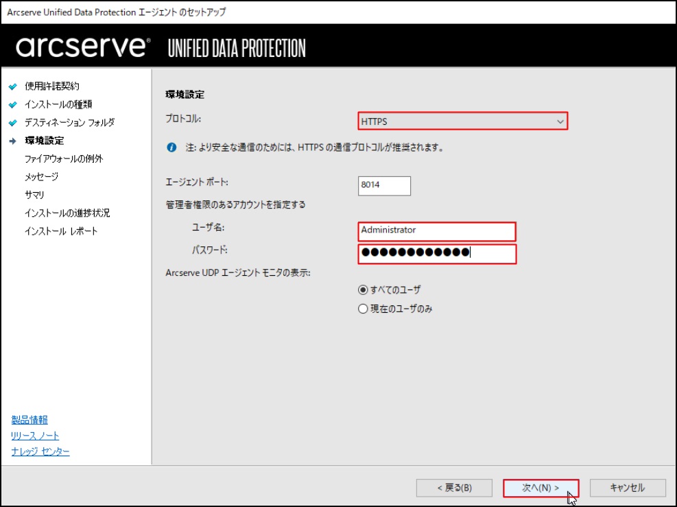 - 使用するプロトコルを [HTTPS] または [HTTP]から選択します。ここでは、[HTTPS]を選択します。このポート番号は、Web ベースの UI に接続する際に使用されます。デフォルト値:8014※補足Arcserve UDP Agent (Windows のインストールで利用可能なポート番号は 1024~65535です。指定したポート番号が空いていて利用可能であることを確認してください。セットアップでは、利用可能でないポートではArcserve UDP Agent (Windows)をインストールできません。ここで登録したポート番号を使用して、Arcserve UDP Agentの操作をリモートのブラウザーからも行うことができます。バックアップに使用する Windows 管理者の「ユーザ名」と「パスワード」を入力し、[次へ]をクリックします。