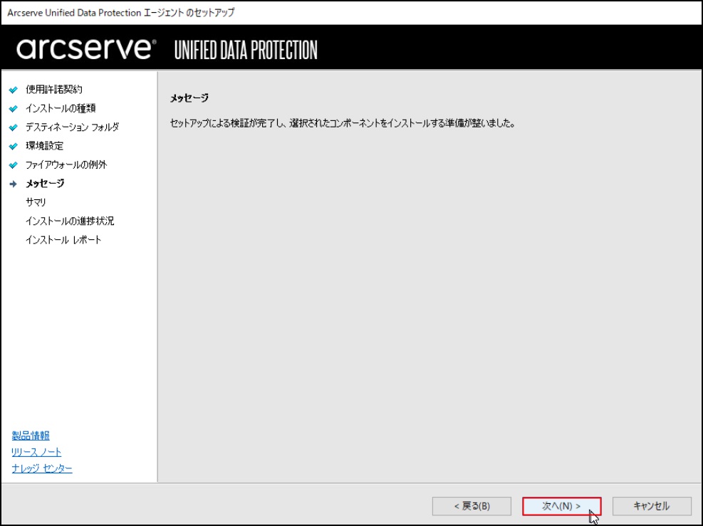 - セットアップの検証が完了し、インストールの準備が整うと、以下の画面が表示されます。[次へ]をクリックします。