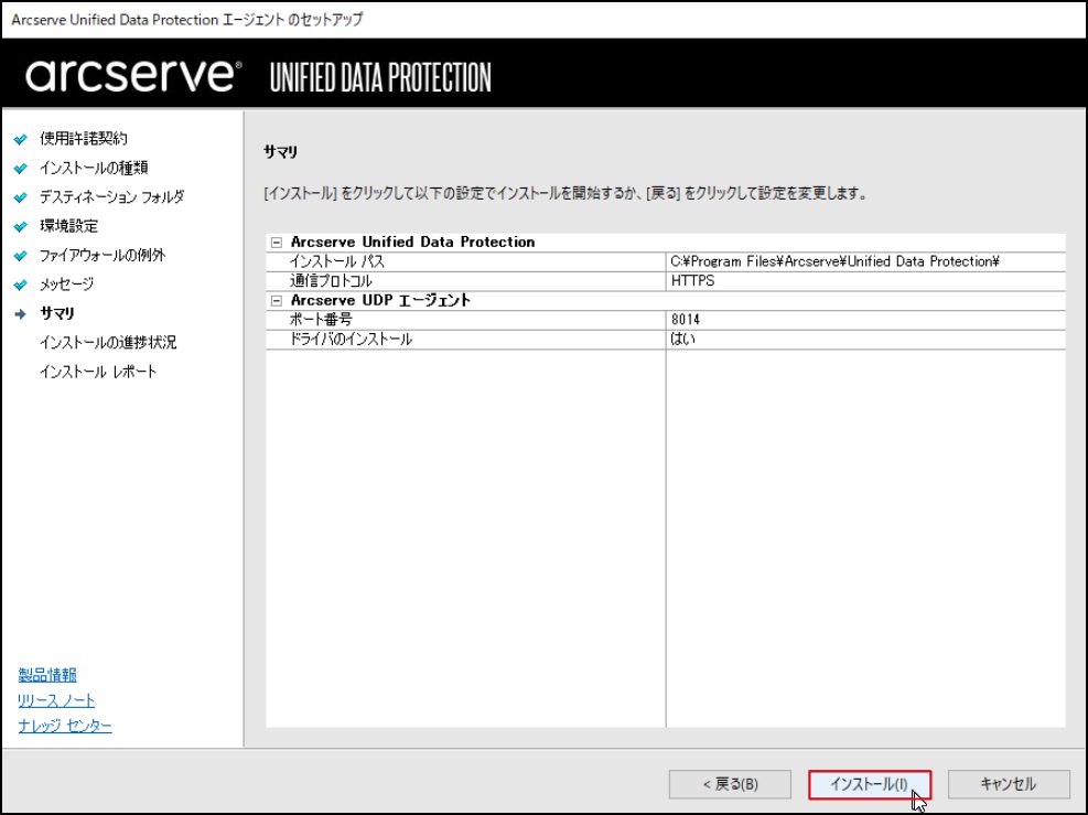 サマリー画面が表示されます。 [インストール]をクリックします。