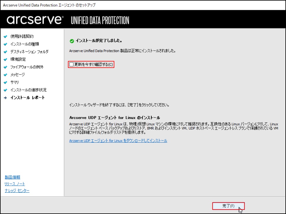 - [更新を今すぐ確認する]にチェックが入っていない状態で、[完了]をクリックします。[更新を今すぐ確認する]チェックボックスを選択した場合、製品の更新を確認することができ、最新の状態にすることができます。