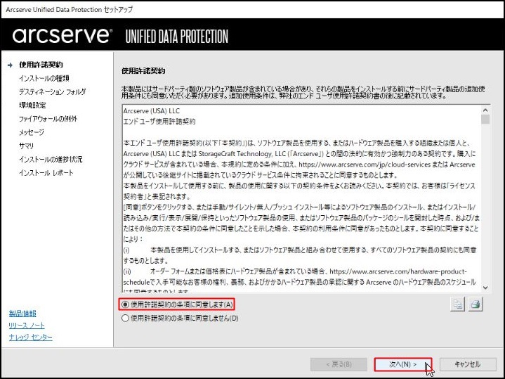 - [Arcserve Unified Data Protection-エージェント]を選択し、[次へ]をクリックします。※ここでは、「Arcserve UDPエージェント」のみ、インストールします。