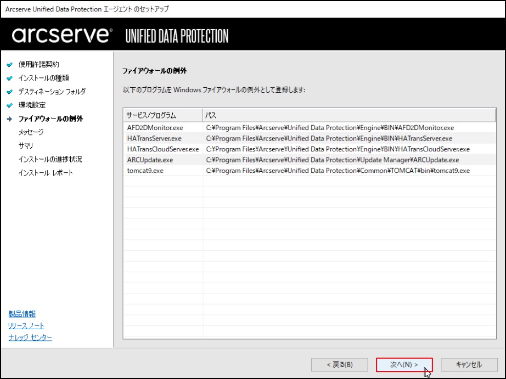 - 利用するプログラムが Windows ファイアウォールの例外として登録されます。[次へ]をクリックします。
