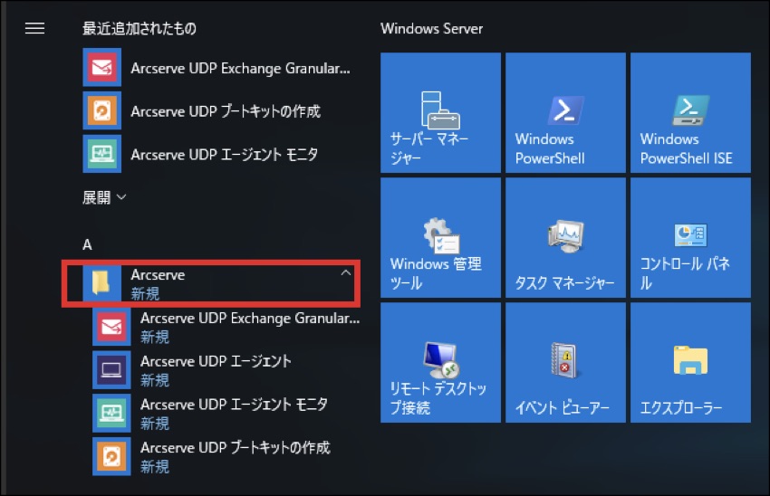 - OSのアプリケーション一覧表示機能で、以下のようなArcserveの項目が表示されていることを確認します。※インストール時に選択した内容で、ここに表示される項目は変わります。以上でインストールは完了です。