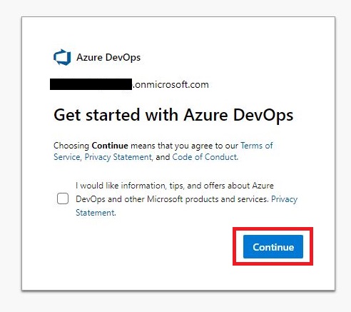 「Get started with Azure DevOps」画面で[Continue]をクリックします。