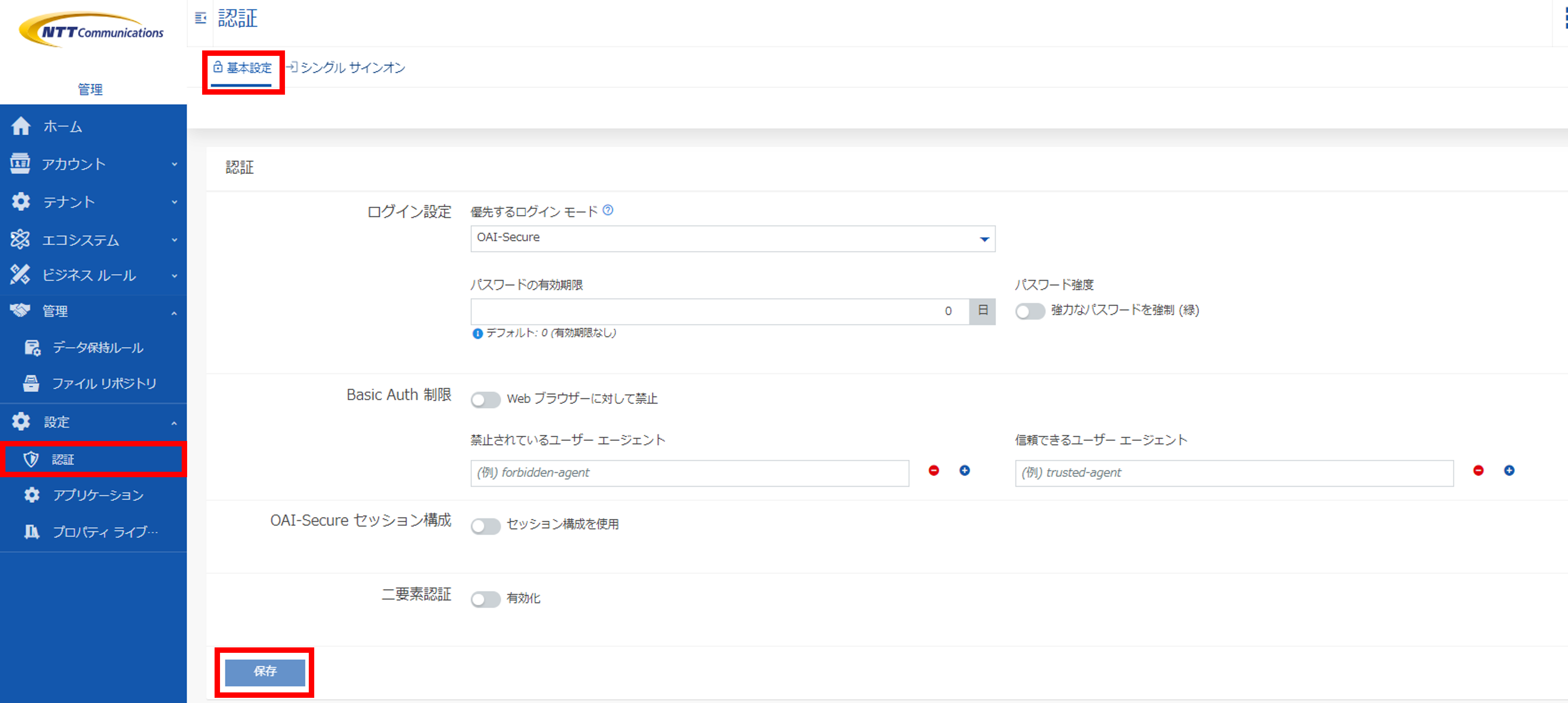 [設定]>[認証]>[基本設定]をクリックし、以下のとおり設定を変更し[保存]をクリックしてください。