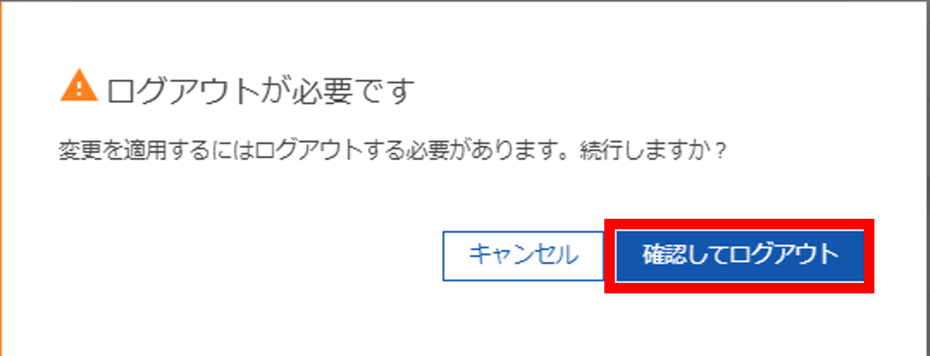 保存後、「ログアウトが必要です」と表示されるので[確認してログアウト]をクリックしてください。ログアウト後に再度ログインを行い設定が変更されていることを確認し完了です。
