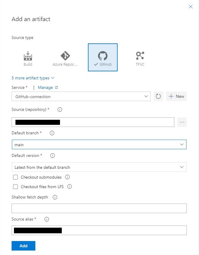 「Add an artifact」画面にて以下のとおり入力・選択し、[Add]をクリックします。
