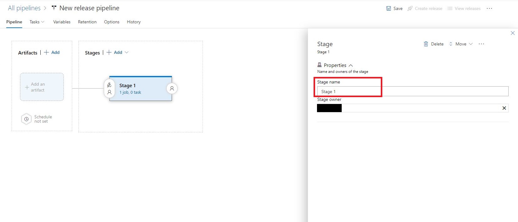 「Stage」画面にて、Stage名(Stage name)を指定します。