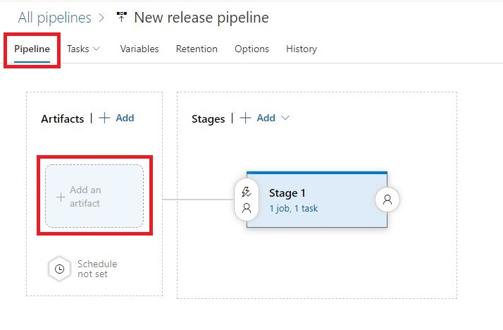 [Pipeline]タブに移動し、「Artifacts」枠内の[+ Add an artifact]をクリックします。