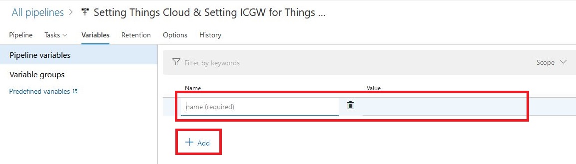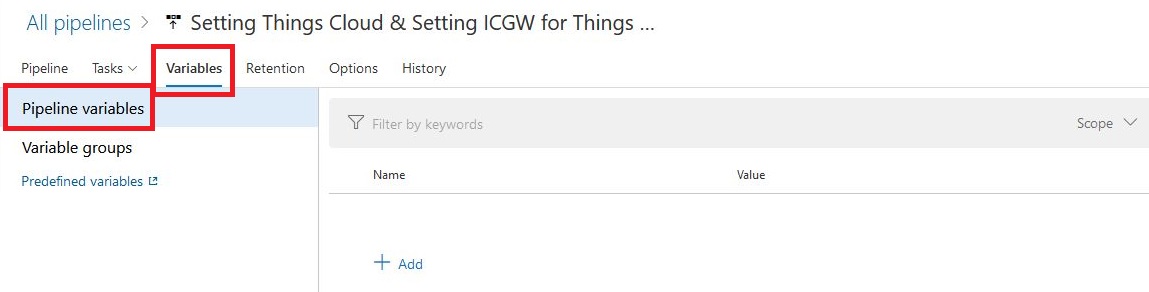 [Variables]タブ>[Pipeline variables]をクリックします。