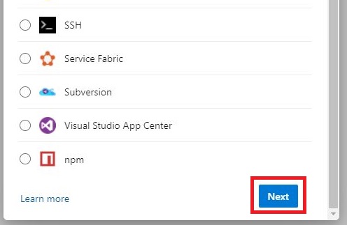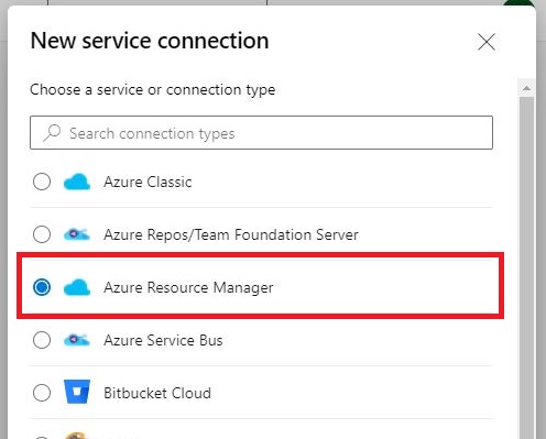 「Choose a service or connection type」画面にて[Azure Resource Manager]を選択し、[Next]をクリックします。