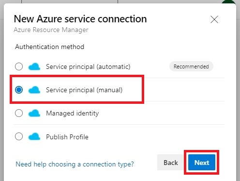 「Authentication method」画面にて[Service principal(manual)]を選択し、[Next]をクリックします。
