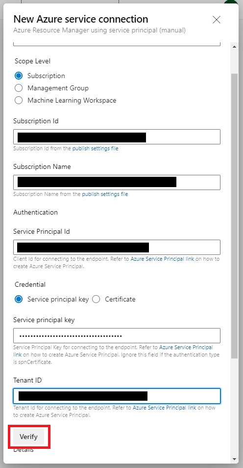 上記手順で作成したサービスプリンシパルをAzure DevOpsに登録し、Azureへの接続設定をします。