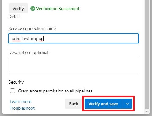 Service connectionの作成画面にて、以下のとおり入力・選択し、[Verify]をクリックします。