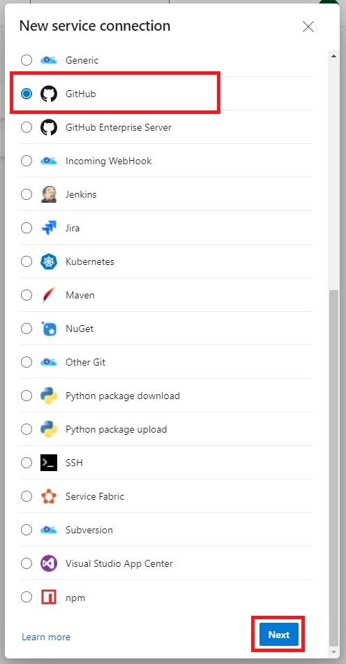 「New service connection」画面にて[GitHub]を選択し、[Next]をクリックします。