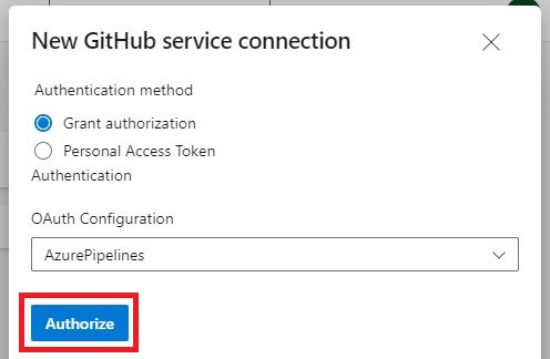 「New GitHub service connection」画面にて以下のとおり入力・選択し、[Authorize]をクリックします。