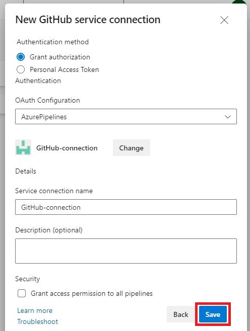 「New GitHub service connection」画面にて、残りの空欄を以下のとおり入力・選択し、[Save]をクリックします。