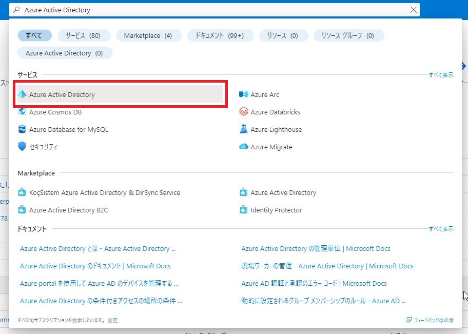 画面上部の検索窓にて「Azure Active Directory」と入力し、検索結果より[Azure Active Directory]をクリックします。