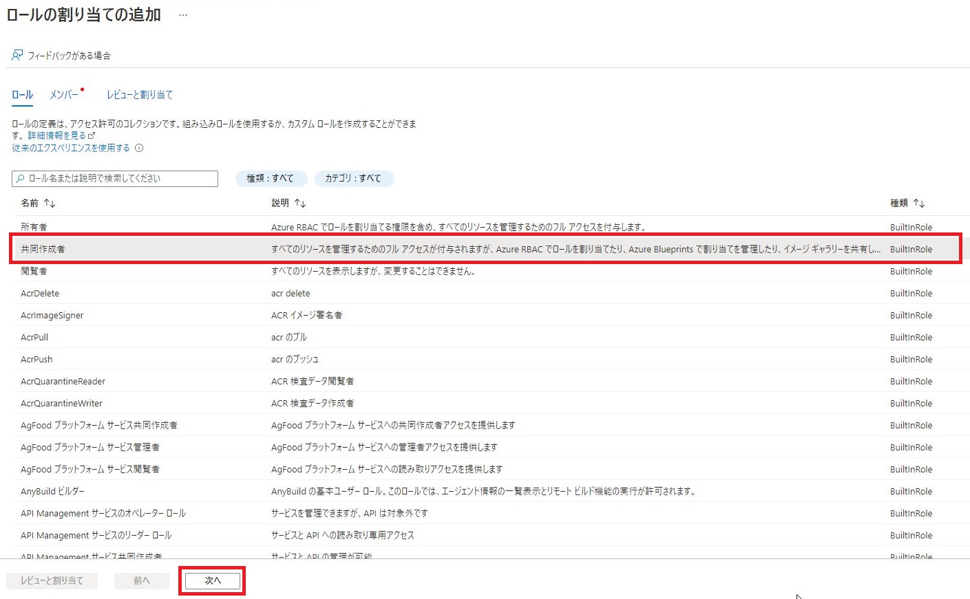 「ロールの割り当ての追加」画面に表示された「ロール」リストより、[共同作成者]を選択し、[次へ]をクリックします。