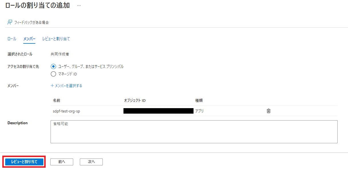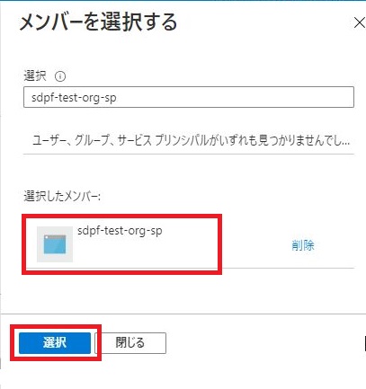 [+ メンバーを選択する]をクリックし、上で作成したサービスプリンシパルを検索して選択し、[選択]をクリックします。