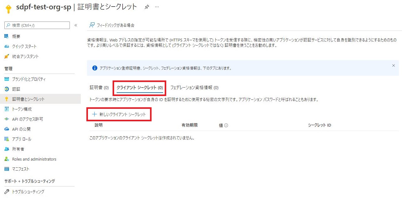 [クライアント シークレット]タブを選択し、[+ 新しいクライアント シークレット]をクリックします。