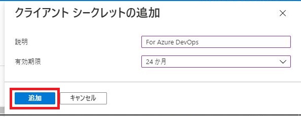 表示された「クライアント シークレットの追加」画面にて、以下のとおり入力・選択し、[追加]をクリックします。