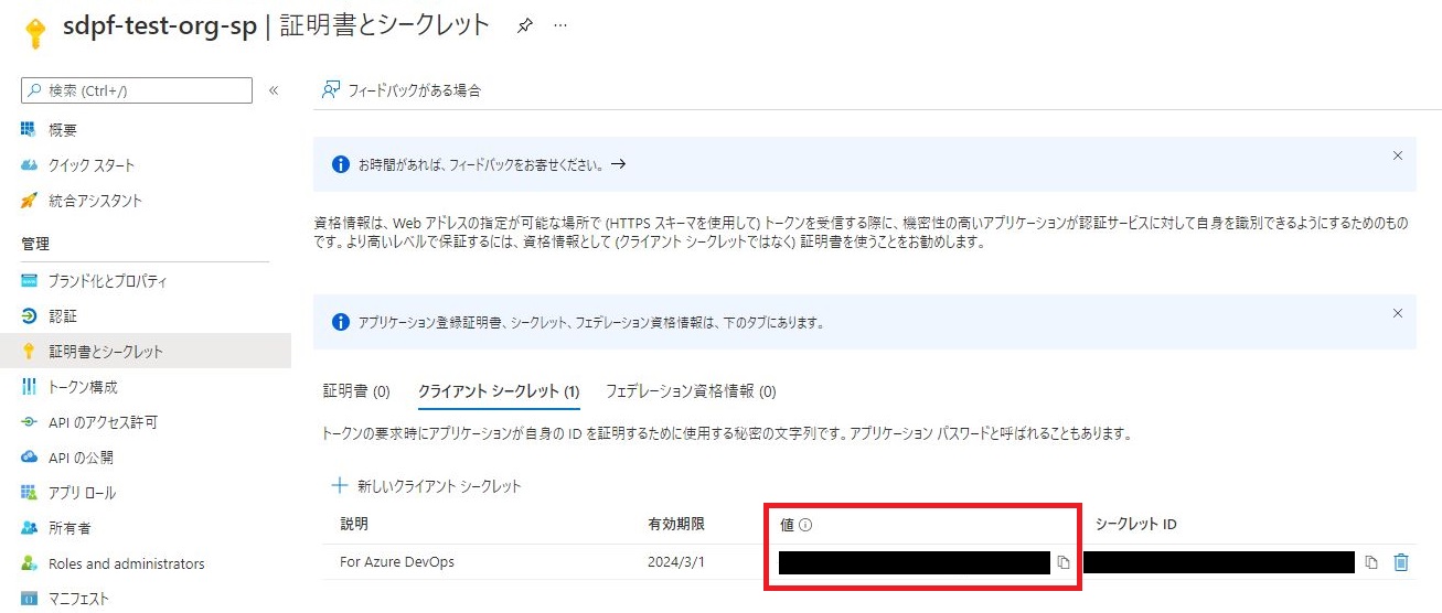クライアントシークレットが正しく作成されたことを確認し、「値」の文字列を控えておきます。