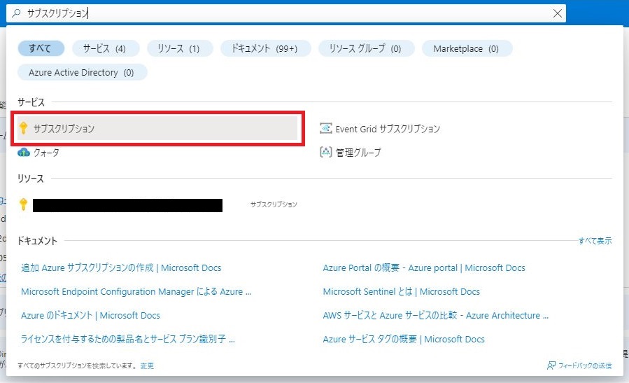 Azure Portal画面上部の検索窓にて、「サブスクリプション」と入力し、検索結果より[サブスクリプション]をクリックします。