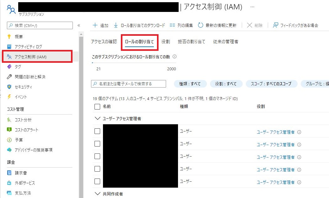 画面左のメニューより、[アクセス制御(IAM)]をクリックし、[ロールの割り当て]をクリックします。