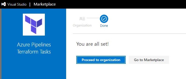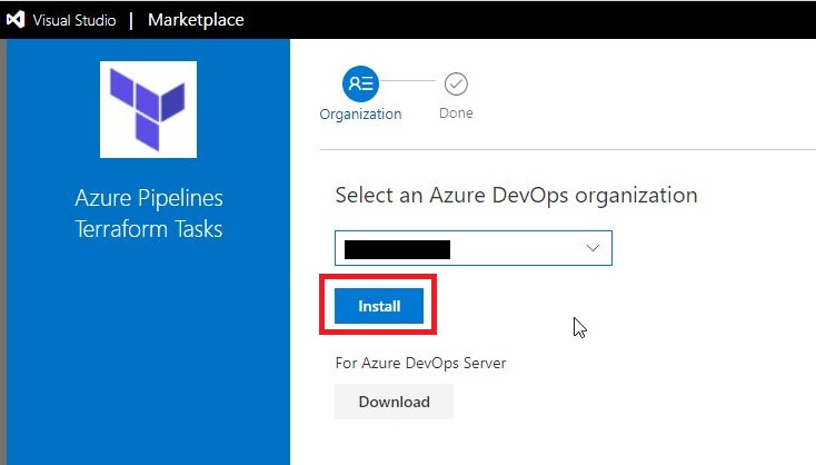 「Select an Azure DevOps organization」画面にて、作成した組織を選択し[Install]をクリックします。