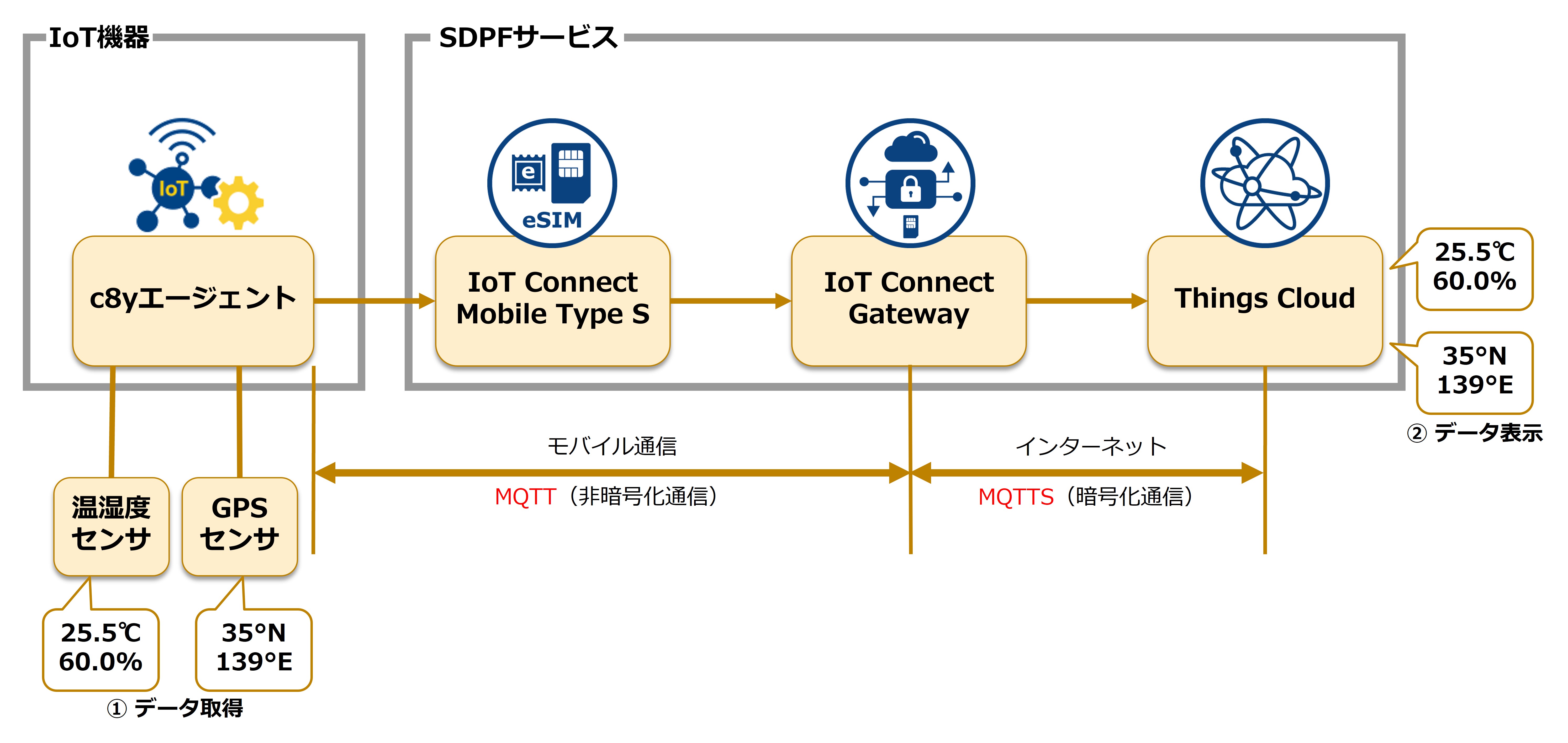 - IoT機器に導入されたc8yエージェントを起動し、Things Cloudとの間でMQTT通信を行います。