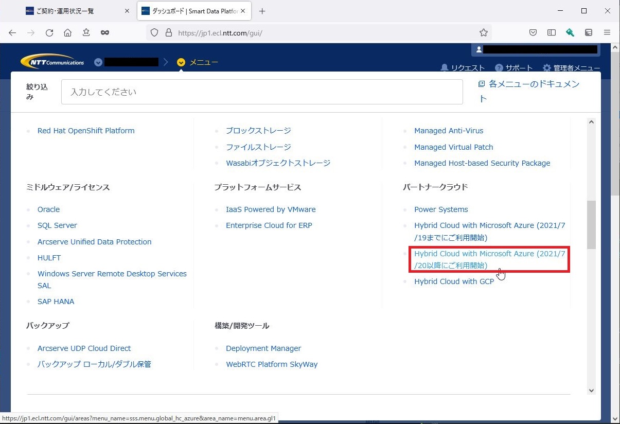 SDPFダッシュボード画面上部の[メニュー]>[Hybrid Cloud with Microsoft Azure (2021/7/20以降にご利用開始)]をクリックします。