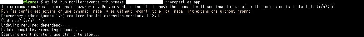 「The command requires the extension azure-iot. Do you want to install it now? The command will continue to run after the extension is installed. (Y/n):」と表示された場合は、「Y」を入力し、「Enter」を押してください。