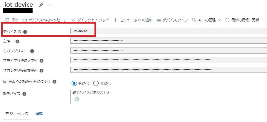表示されたデバイス詳細画面にて、項目「デバイスID」を確認・保存してください。こちらの値が「Azure IoT Hubに登録したデバイスのデバイスID」です。
