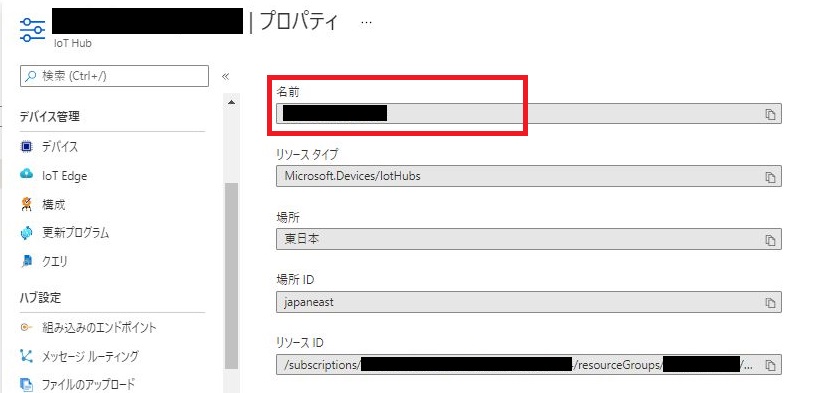 表示されたプロパティ画面より、項目「名前」を確認・保存してください。こちらの値が「Azure IoT Hub名」です。